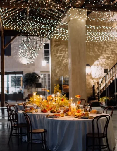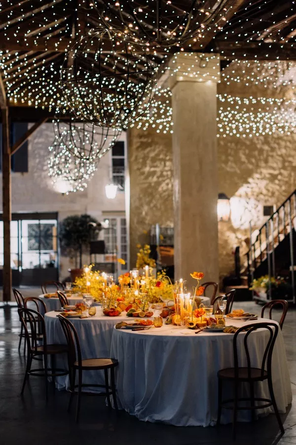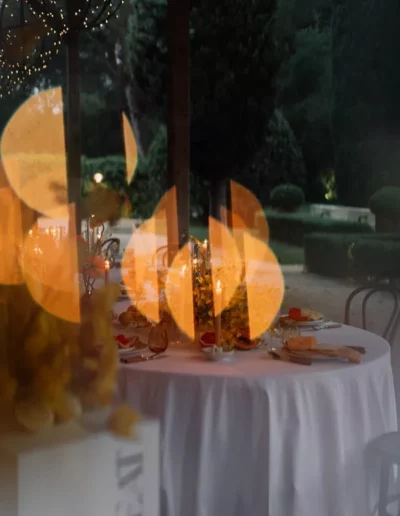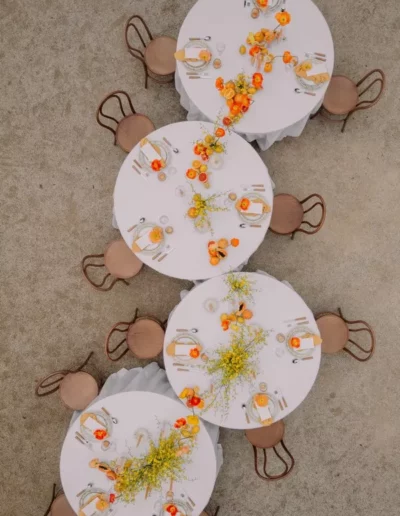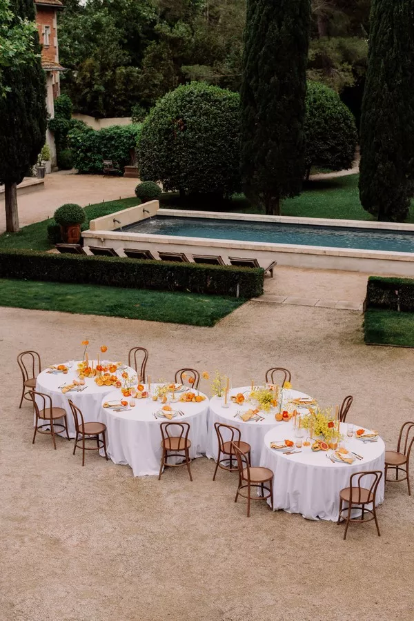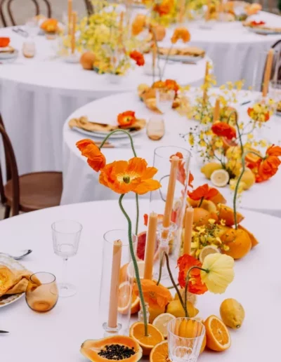 Les tables rondes nappées de blanc jouent la carte de l’élégance intemporelle. Mais leur configuration en serpentine donne le ton et anime la scène. Des bougies fines aux teintes miel, des verres délicatement teintés, des fleurs légères et dansantes… et surtout, ces fruits déposés comme des touches de couleur spontanées.