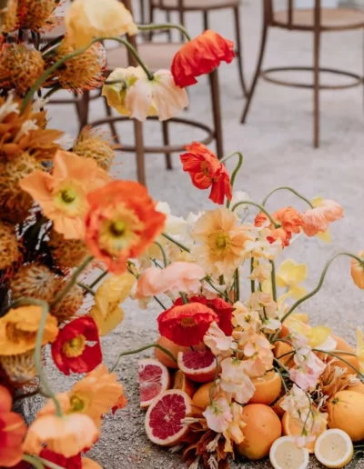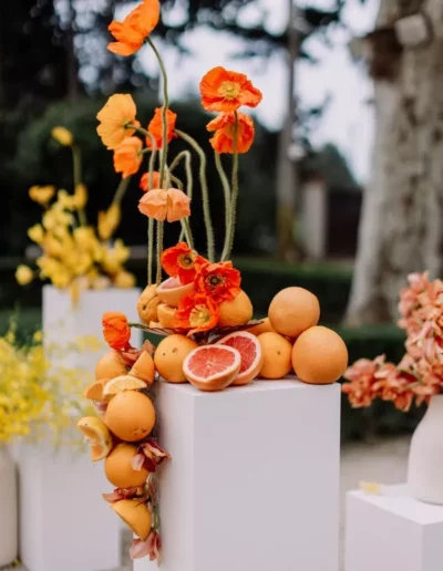 Associés à une abondance d’agrumes – oranges, citrons, pamplemousses, oranges sanguines – les arrangements deviennent sensoriels. On imagine les parfums, on ressent la fraîcheur, on perçoit l’énergie. Le résultat est résolument hespéridé : festif et inoubliable.