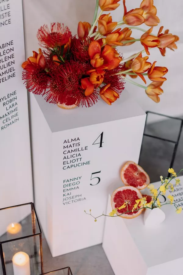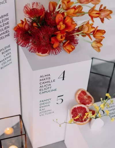 Les colonnes blanches, élément clé de cette scénographie, structurent l’espace avec modernité. Elles apportent du rythme, de la verticalité, et surtout une vraie signature visuelle. Un choix fort, minimaliste en apparence, mais terriblement impactant, que l’on retrouvera d’ailleurs dans le plan de table, l’un de nos coups de cœur de la décoration de ce mariage coloré.