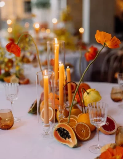 Autour, quelques fleurs, des agrumes et des bougies viennent adoucir la composition.
