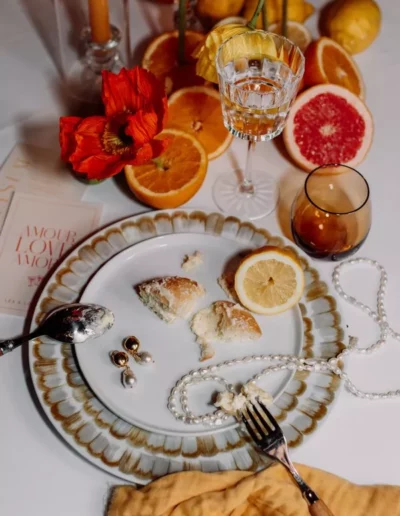 Une demi-papaye, des rondelles d’orange, des citrons entiers autant de détails qui donnent à la table un aspect presque pictural, vivant et joyeux.
